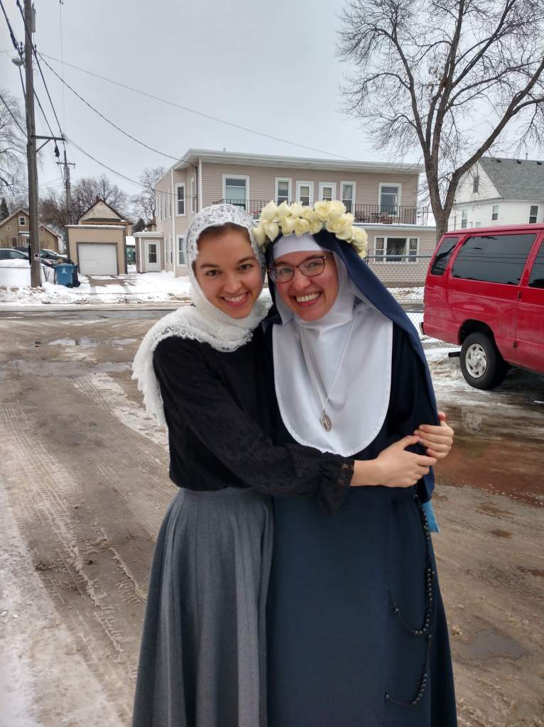 And here I am with my sister in her crown after it was blessed by His Eminence Cardinal Burke with a special blessing for “ornaments” in the vow ceremony: